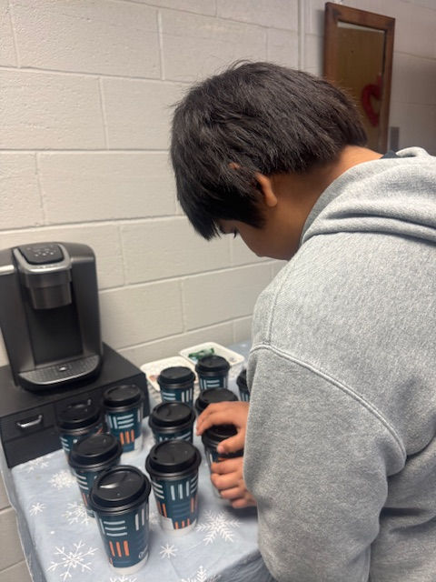 Each week, one group takes drink orders, and another prepares and delivers them. The café offers coffee, tea, and hot chocolate to staff members.